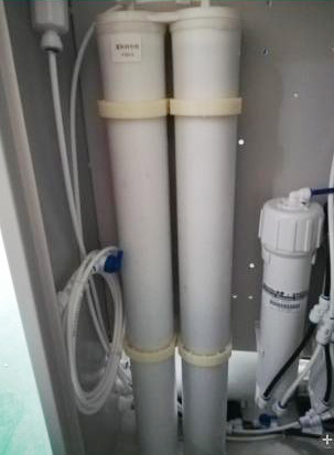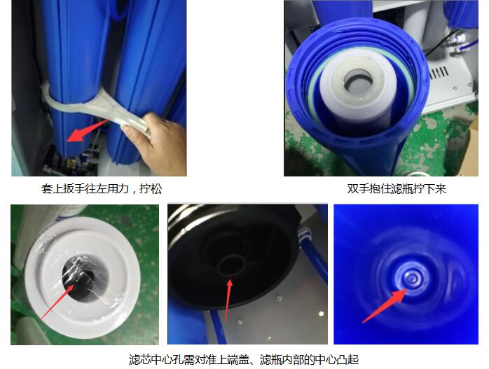 管子取下來完后將新的膜換上去,反滲透膜在更換后不能馬上將純水管與純化柱(或純化罐)連接,需將反滲透膜進行沖洗,沖洗時將廢水調(diào)節(jié)閥全開,沖洗20~30分鐘后,待純水水質(zhì)穩(wěn)定后,測試其脫鹽率,脫鹽率達標(1812膜脫鹽率在97%以上)后才能將純水管與純化柱(或純化罐)連接。注:藍色管為源水管,黑色管為廢水管,白色/灰色管為純水管,位置一定不能反接亂接。