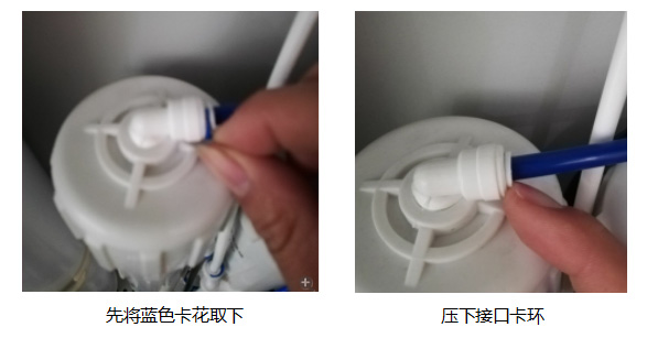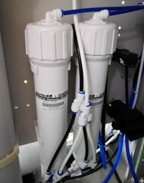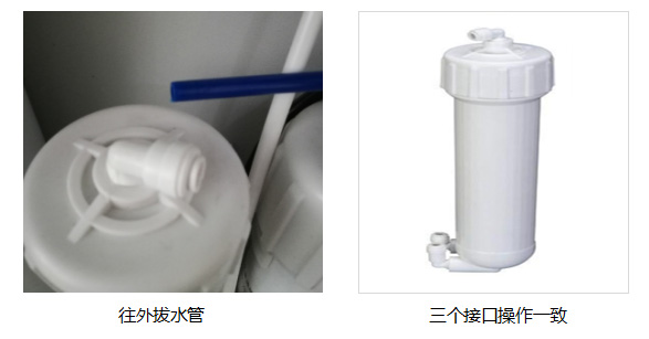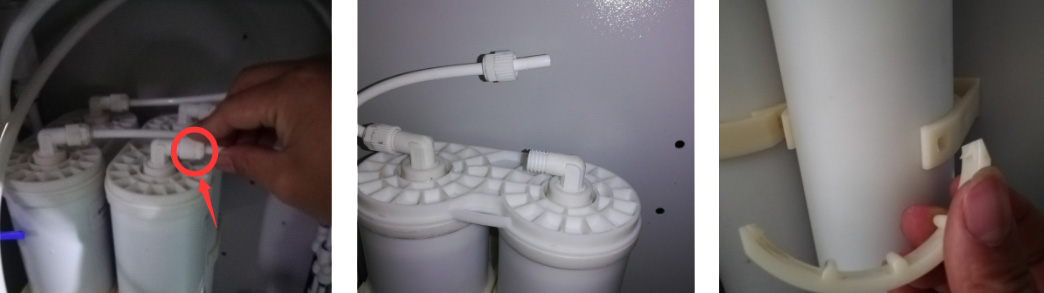 將純化柱接口擰下來,然后取下純化柱卡扣,這個時候純化柱就能很順利的取下了;然后將新的純化柱放上去,管路按照上面的反順序固定好純化柱,接好水管(兩個接口無方向,但是建議按照原來的順序接管子)。