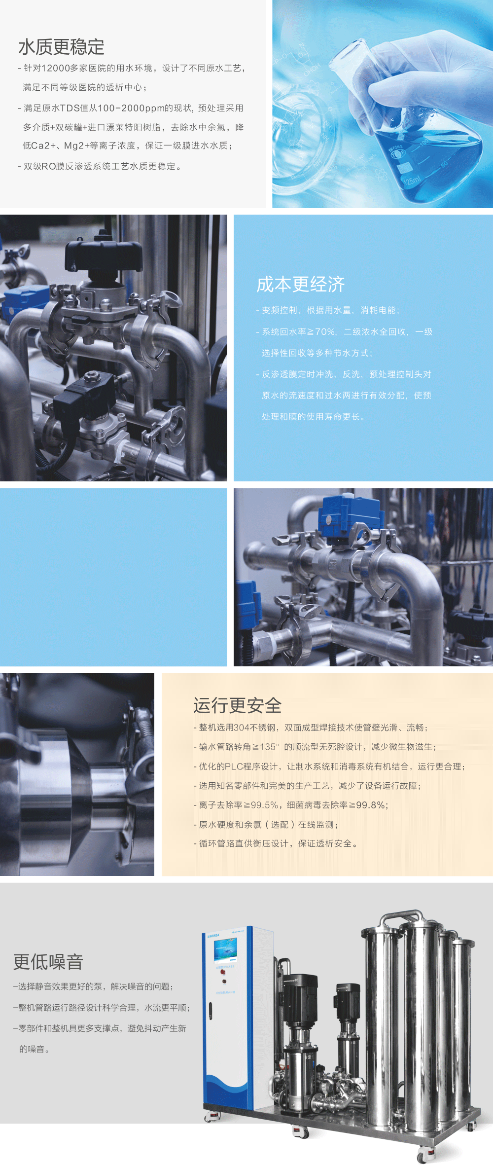 血液透析用制水設(shè)備EKUS-III系列滿足于10床、10-20床、20-40床、40-60床、60-80床、80-100床、100-150床、150床以上血液透析機(jī)配套使用。